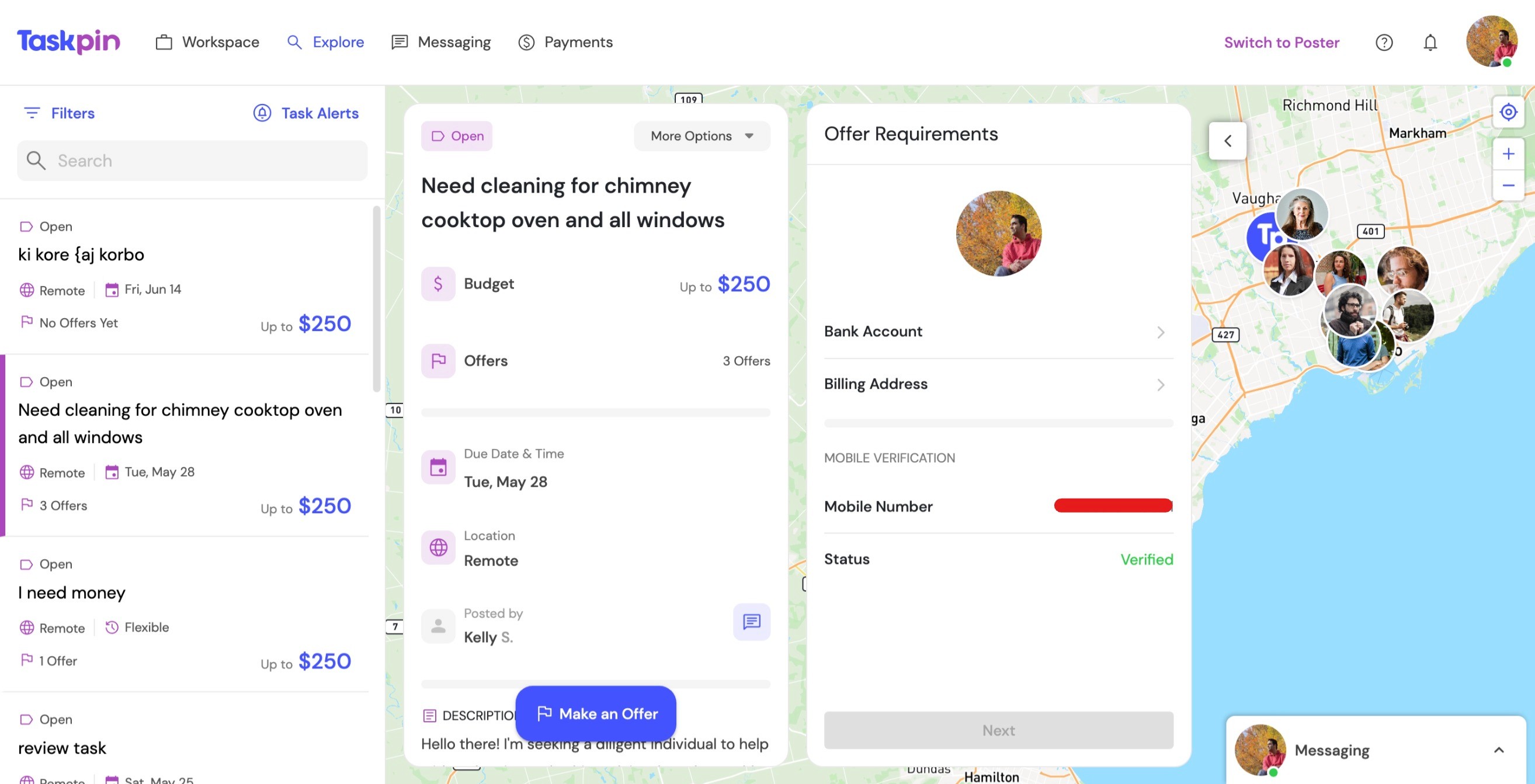 Making an offer is a crucial process in Taskpin, as it allows the Tasker (the person who provides services) to write text or record a short video for their offer. To complete this process, users must provide important information such as a billing address, bank account details, and more in their profile. Reviewing Hotjar recordings indicated that users could encounter issues while adding this information.