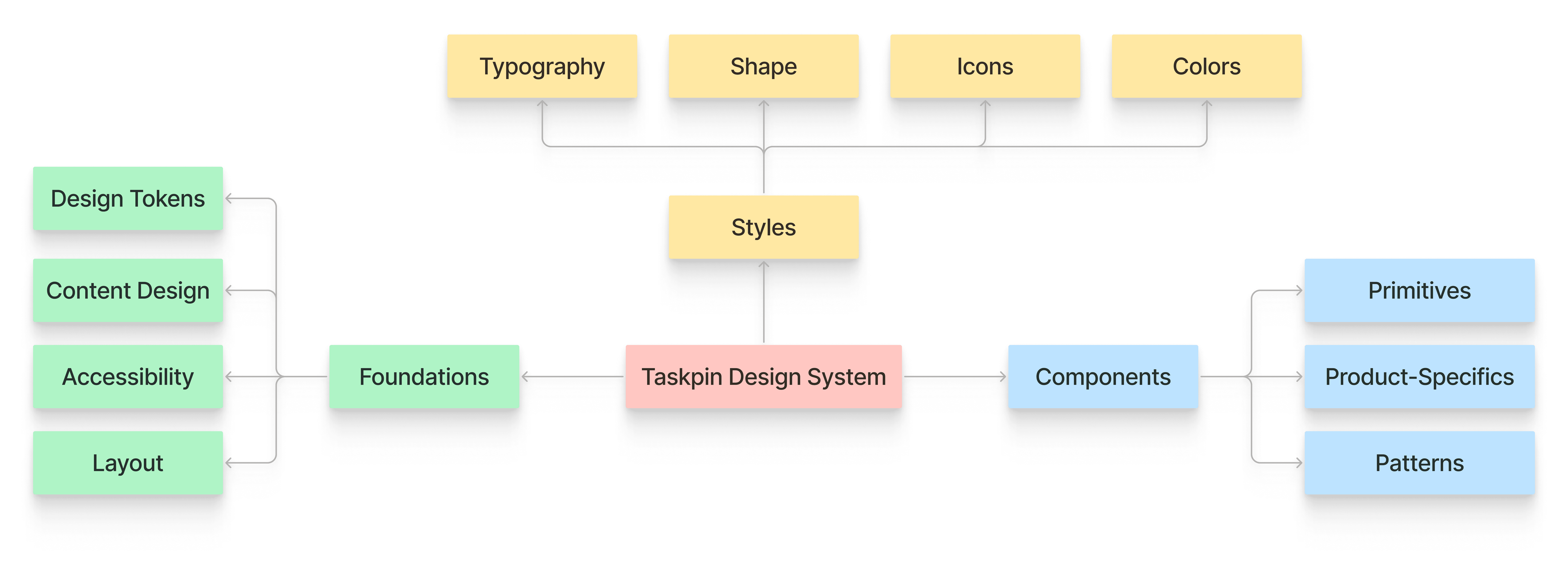 This diagram shows three main elements of the Taskpin Design System, Foundations, Styles, and Components, that have been developed so far.