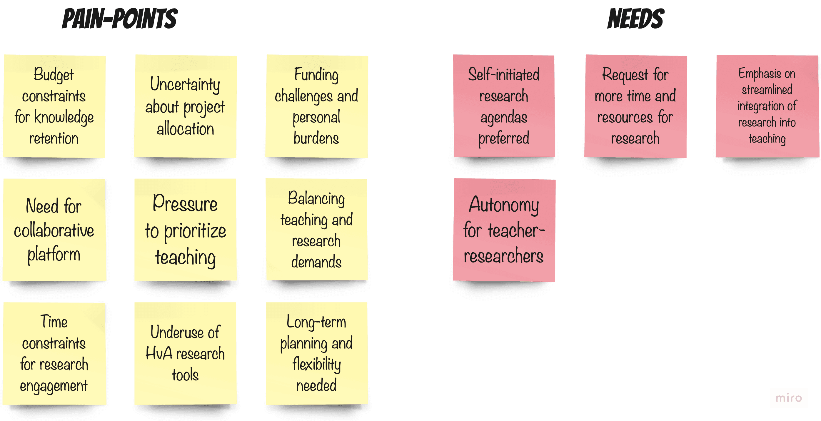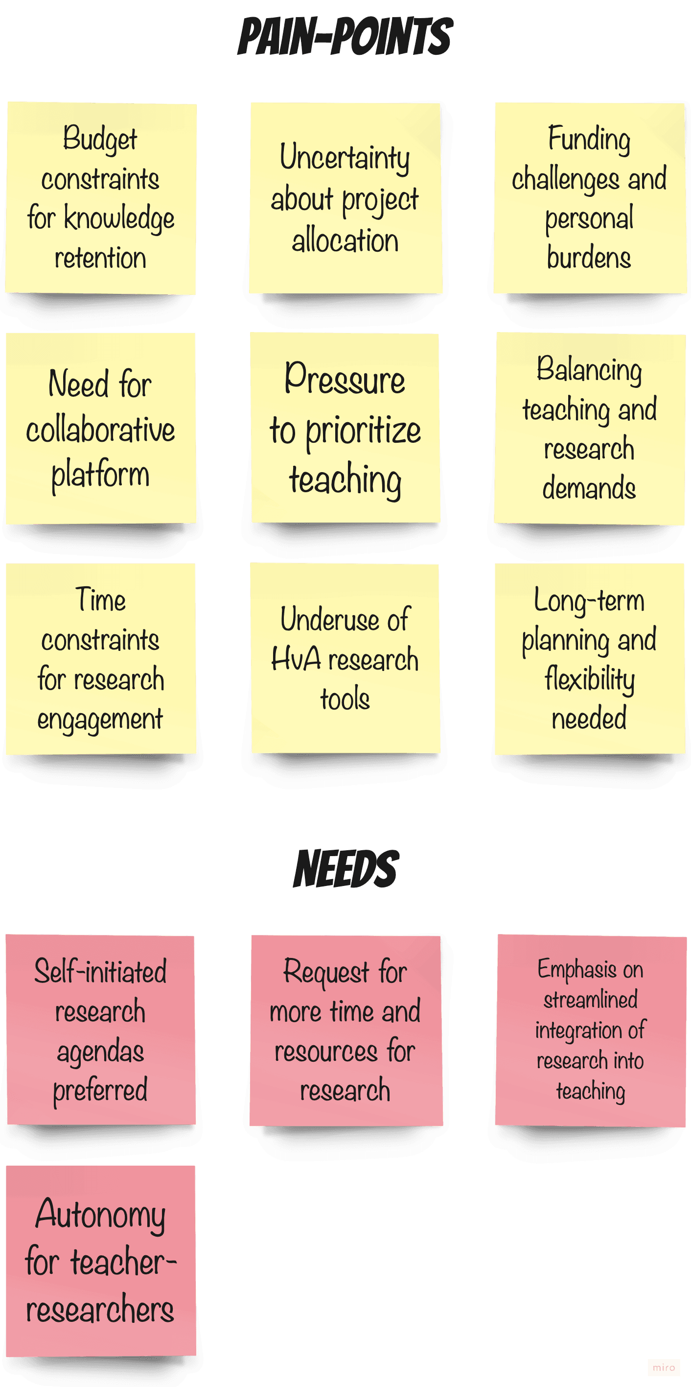 The team engaged a group of 7 teacher-researchers to explore their individual and collective motivations and pain points, which played key roles in the creation of our empathy and affinity maps (sample empathy map from one of our personas).