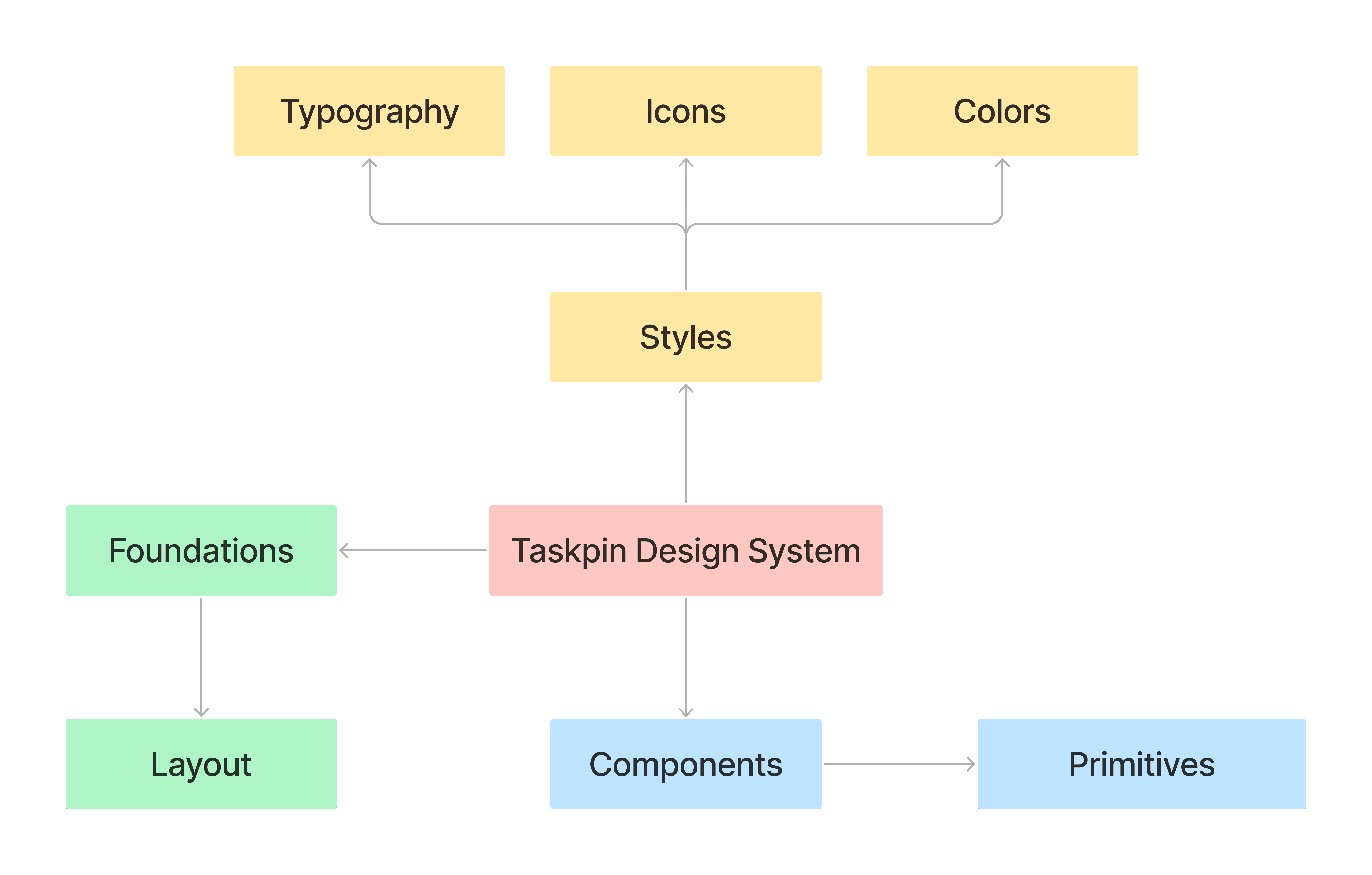 A design system is a product in itself, which requires iterative development. My vision for the Taskpin Design System was to have the following structure: